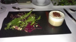 First off, we were met outside the restaurant by a lovely young man armed with the amuse bouche of the evening, a veal pastrami on crostini. He had me at hello. Inside, the restaurant is simply darling – dim lights, gorgeous table settings and a killer view of the Arrows gardens, which that night were adorned by pumpkins of all shapes, sizes and colors.